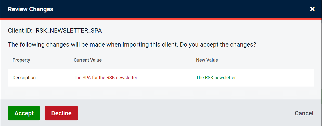 An example of this is where a client is the same in the import as it is in the current system, it has a protected resource that is in the import and in the current system but the protected resource has changes between the import and in the current system